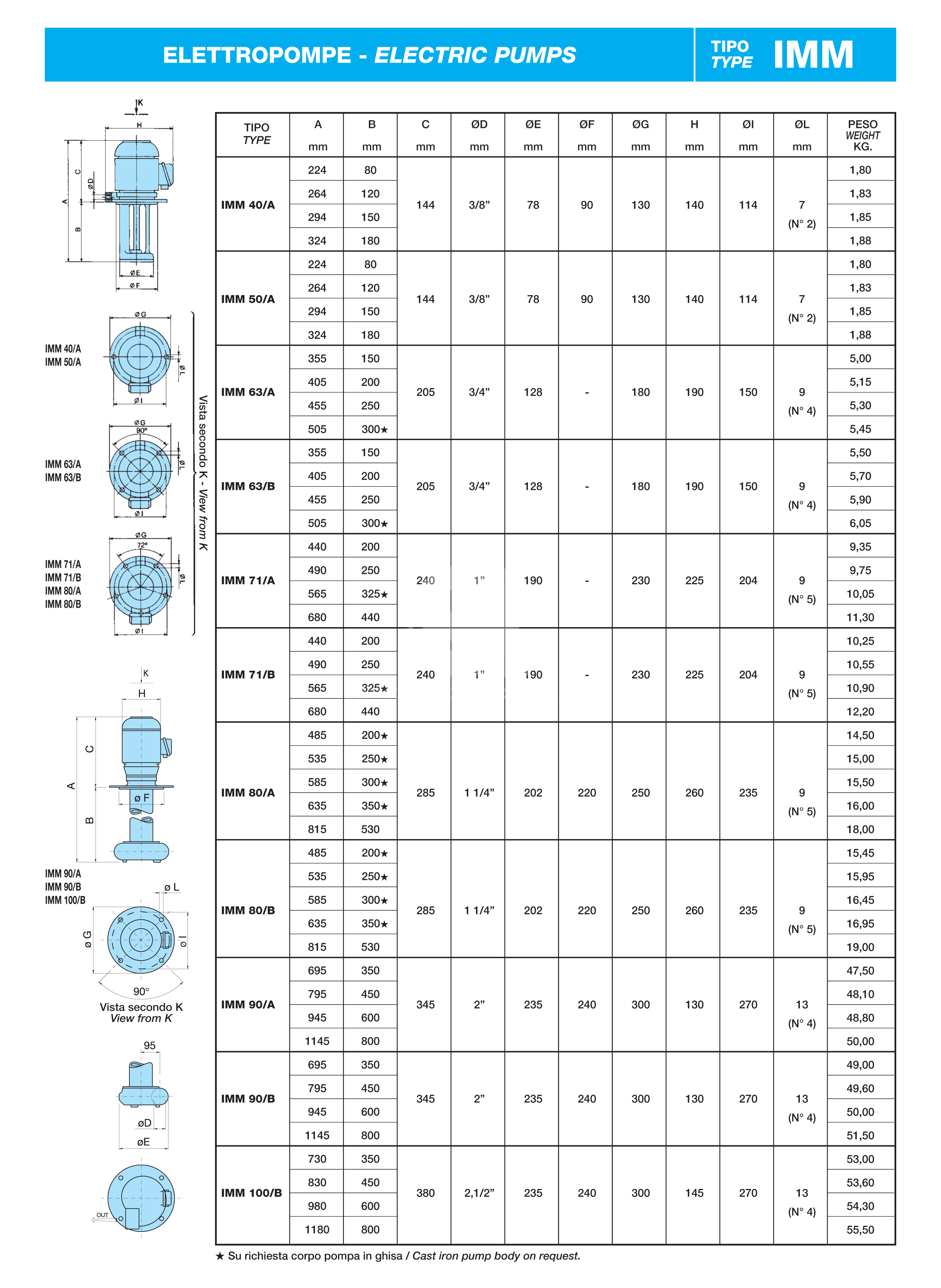 IMM 40-50: rodete, espiral y cuerpo de la bomba en PBT, permiten su uso con agua, emulsiones y sustancias oleosas en general, con una viscosidad no superior a 3° Engler (21 CST). La temperatura del líquido no debe superar los 70° C.