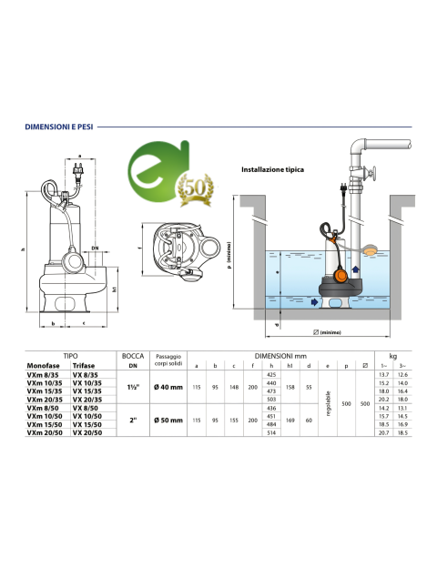 Caratteristiche tecniche Elettropompa sommergibile Pedrollo Vortex VXm 10/50